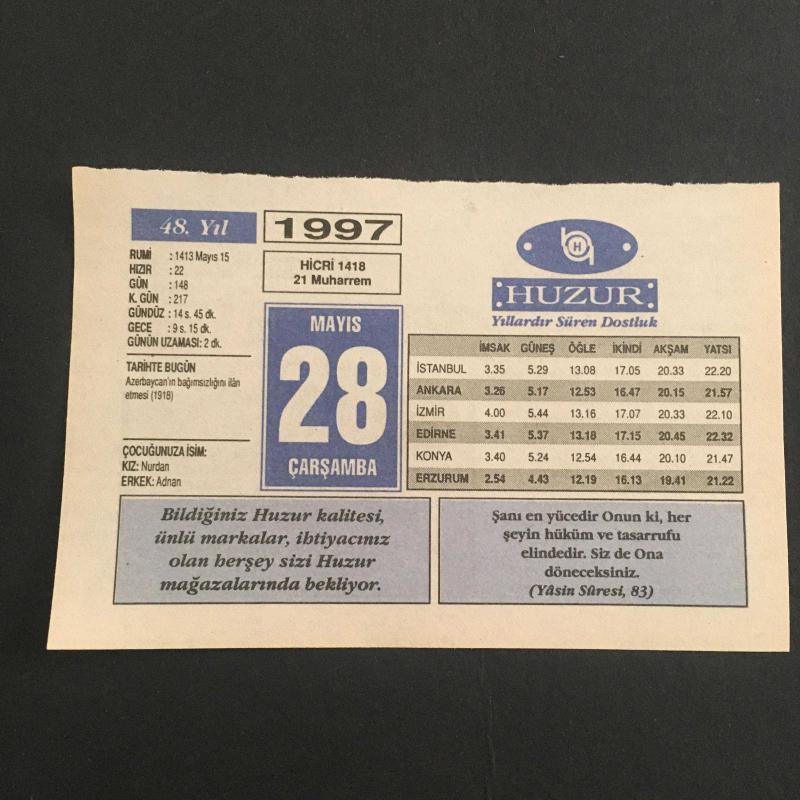 28 MAYIS 1997 -TAKVİM YAPRAĞI-DOĞUM GÜNÜ HEDİYESİ-HUZUR TAKVİMİ,AZERBAYCANIN BAĞIMSIZLIĞINI İLAN ETMESİ,1918,ÇOCUĞUNUZA İSİM,KİMLERLE ARKADAŞLIK YAPILMAZ,GÜZEL ELBİSE, en son 8 ay önce güncellenmiştir.