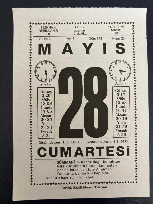 28 MAYIS 2005 - TAKVİM YAPRAĞI - DOĞUM GÜNÜ HEDİYESİ - BÜYÜK SAATLİ MAARİF TAKVİMİ - MİMAR SİNAN DOĞDU - DEMİR YOLU ANKARA'DAN KAYSERİYE ULAŞTI - PAPAĞANLAR ARASINDA, 6 ay önce satışa sunulmuştur.