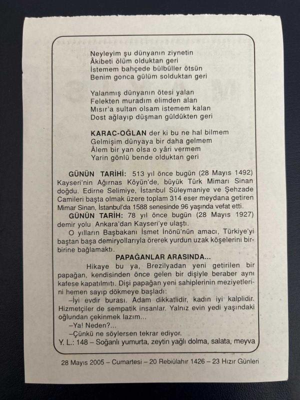 28 MAYIS 2005 - TAKVİM YAPRAĞI - DOĞUM GÜNÜ HEDİYESİ - BÜYÜK SAATLİ MAARİF TAKVİMİ - MİMAR SİNAN DOĞDU - DEMİR YOLU ANKARA'DAN KAYSERİYE ULAŞTI - PAPAĞANLAR ARASINDA başlıklı ürün, Efemera, Müzik, Sinema > Belge ve Evraklar > Takvimler kategorisi altında İkinci El olarak satılmaktadır.