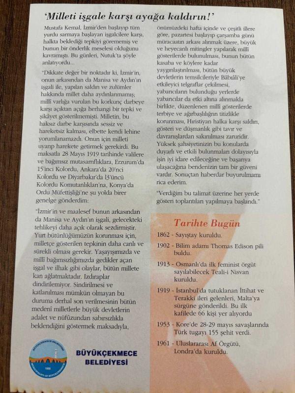 28 MAYIS 2008 - TAKVİM YAPRAĞI - DOĞUM GÜNÜ HEDİYESİ - GAZİ MUSTAFA KEMAL ATATÜRK FOTOĞRAFLI BÜYÜKÇEKMECE BELEDİYESİ TAKVİMİ - Harp Akademileri Tatbikatı'nda - 'Milleti işgale karşı ayağa kaldırın!' - 1862 - Sayıştay kuruldu. 1902 - Bilim adamı Thomas Edison pili buldu. - 1953 - Kore'de 28-29 mayıs savaşlarında Türk tugayı 155 şehit verdi. -, 3 ay önce satışa sunulmuştur.