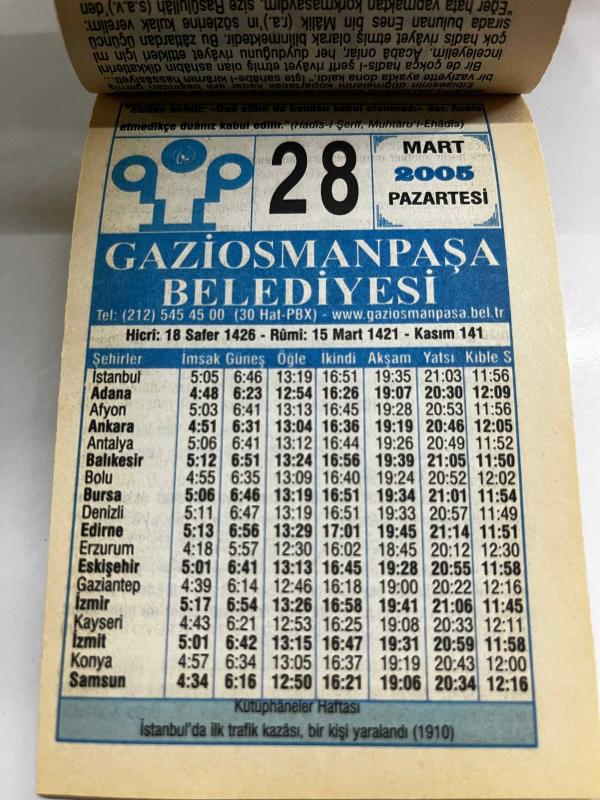 28 Mart 2005- GAZİOSMANPAŞA BELEDİYESİ TAKVİMİ- DOĞUM GÜNÜ HEDİYESİ- kütüphaneler haftası-İstanbul’da ilk trafik kazası bir kişi yaralandı 1910, en son 6 ay önce güncellenmiştir.