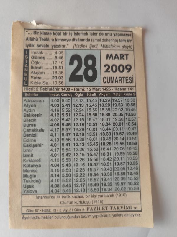 28 Mart 2009-Orijinal Takvim Yaprağı-Doğum Günü-Söz,Nişan,Nikâh,Düğün ve Önemli Günler Hediyesi-Fazilet Takvimi-Ayet(Hadis)(Hadis-i Şerif, Müttefekun aleyh)-İstanbul'da İlk trafik kazası, Bir kişi yaralandı(1910)-Ameller niyetlere göredir-Cömertlik Yarışı başlıklı ürün, Efemera, Müzik, Sinema > Belge ve Evraklar > Takvimler kategorisi altında İkinci El olarak satılmaktadır.