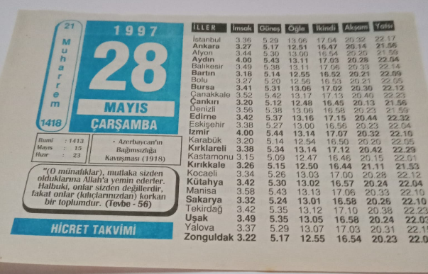 28 Mayıs 1997-Orijinal Takvim Yaprağı-Doğum Günü-Söz,Nişan,Nikâh,Düğün ve Önemli Günler Hediyesi-Hicret Takvimi-Ayet(Hadis)-(Tevbe-56)-Azerbaycan'ın Bağımsızlığa Kavuşması(1919)-Kılıç ve Kın-Zekat-Darani, en son 23 gün önce güncellenmiştir.