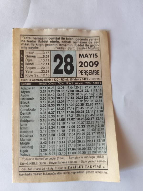 28 Mayıs 2009-Orijinal Takvim Yaprağı-Doğum Günü-Söz,Nişan,Nikâh,Düğün ve Önemli Günler Hediyesi-Fazilet Takvimi-Ayet(Hadis)(Hadis-i Şerif, Sahih-i Müslim )-Türkler'in Rumeli'ye Geçişi (1348)-İstanbul'un Fethi Kararı başlıklı ürün, Efemera, Müzik, Sinema > Belge ve Evraklar > Takvimler kategorisi altında İkinci El olarak satılmaktadır.