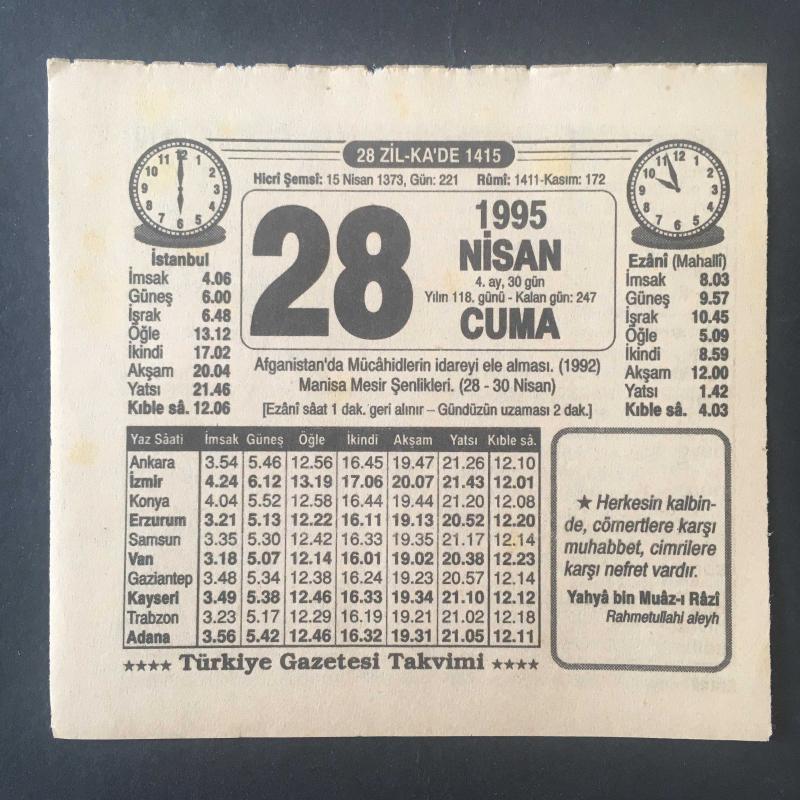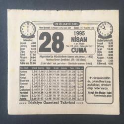 28 NİSAN 1995 -TAKVİM YAPRAĞI-DOĞUM GÜNÜ HEDİYESİ-TÜRKİYE GAZETESİ TAKVİMİ,AFGANİSTANDA MÜCAHİTLERİN İDAREYİ ELE AMASI,1992,MANİSA MESİR ŞENLİKLERİ 28-30 NİSAN,ALLAHU TEALANIN SIFATLARI 2,YEMEK TARİFLERİNDEKİ ÖLÇÜLER