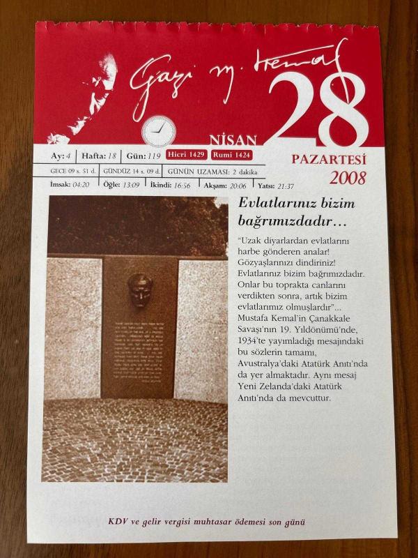 28 NİSAN 2008 - TAKVİM YAPRAĞI - DOĞUM GÜNÜ HEDİYESİ - GAZİ MUSTAFA KEMAL ATATÜRK FOTOĞRAFLI BÜYÜKÇEKMECE BELEDİYESİ TAKVİMİ - Evlatlarınız bizim bağrımızdadır - Çanakkale Savaşı - 4 - 1915- "Hilal-i Ahmer"in adı "Kızılay"a çevrildi - 1945- İtalyan diktatör Mussolini ve metresi Clara Petacci, kurşuna dizildi - 1950- Nightingale Hemşire Koleji İstanbul'da açıldı - 1960- İstanbul Üniversitesi'nde çıkan olaylarda, Orman Fakültesi öğrencisi Turan Emeksiz öldü. İstanbul ve Ankara'da sıkıyönetim ilan edildi başlıklı ürün, Efemera, Müzik, Sinema > Belge ve Evraklar > Takvimler kategorisi altında İkinci El olarak satılmaktadır.
