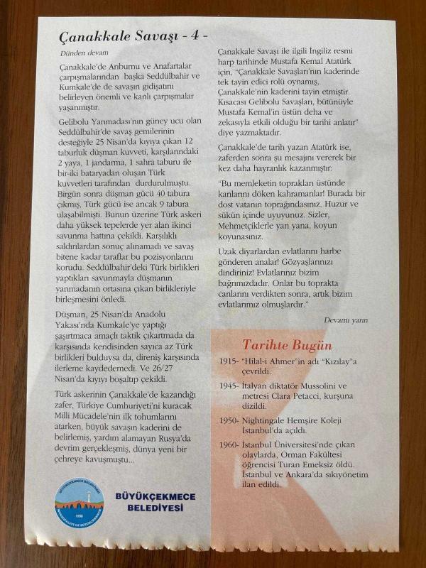 28 NİSAN 2008 - TAKVİM YAPRAĞI - DOĞUM GÜNÜ HEDİYESİ - GAZİ MUSTAFA KEMAL ATATÜRK FOTOĞRAFLI BÜYÜKÇEKMECE BELEDİYESİ TAKVİMİ - Evlatlarınız bizim bağrımızdadır - Çanakkale Savaşı - 4 - 1915- "Hilal-i Ahmer"in adı "Kızılay"a çevrildi - 1945- İtalyan diktatör Mussolini ve metresi Clara Petacci, kurşuna dizildi - 1950- Nightingale Hemşire Koleji İstanbul'da açıldı - 1960- İstanbul Üniversitesi'nde çıkan olaylarda, Orman Fakültesi öğrencisi Turan Emeksiz öldü. İstanbul ve Ankara'da sıkıyönetim ilan edildi, 3 ay önce satışa sunulmuştur.