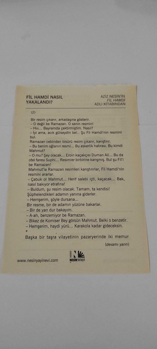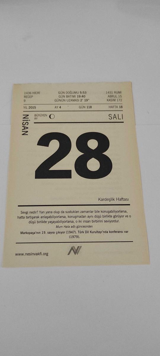 28 Nisan 2015-Orijinal Takvim Yaprağı-Doğum Günü-Söz,Nişan,Nikâh,Düğün ve Önemli Günler Hediyesi-Nesin Vakfı Takvimi-Markopaşa'nın 19. sayısı çıkıyor (1947). Türk Dil Kurultayı'nda konferansı var (1979).-Fil Hamdi Nasıl Yakalandı?-Aziz Nesin'in Fil Hamdi adlı kitabından., en son dün güncellenmiştir.