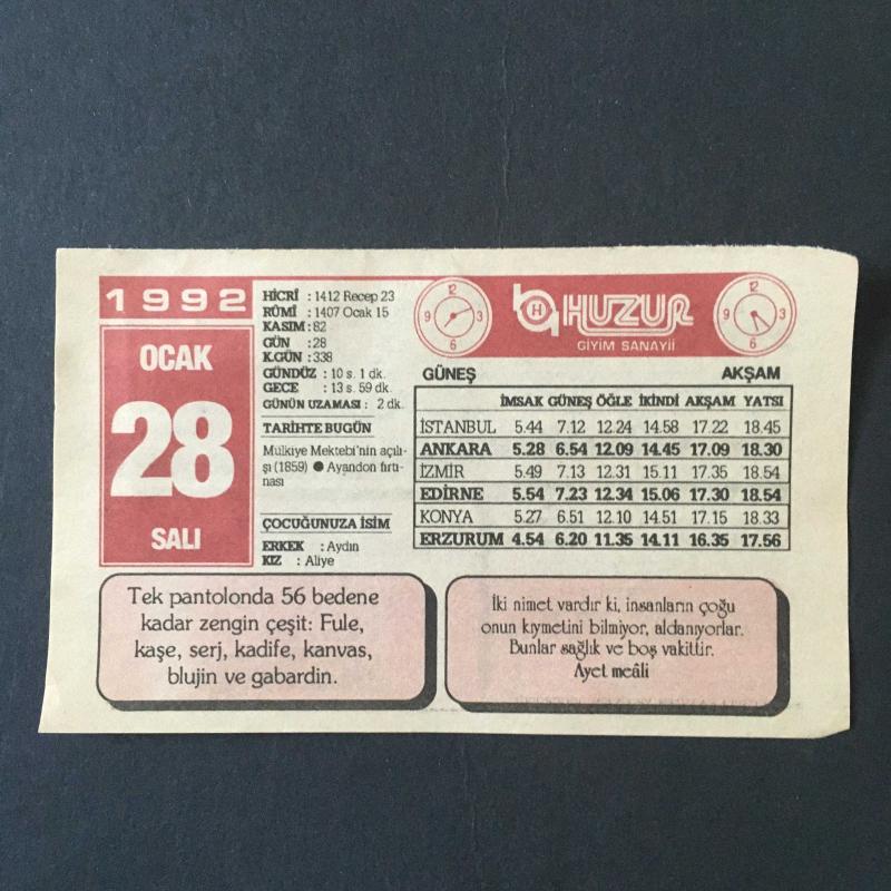 28 OCAK 1992 -TAKVİM YAPRAĞI-DOĞUM GÜNÜ HEDİYESİ-HUZUR TAKVİMİ,MÜLKİYE MEKTEBİNİN AÇILIŞI 1859AYANDON FIRTINASI,RUHUMUZ BAKİDİR,EVDE ADALET,BUZDOLABI FAZLA DOLDURULMAMALI,GÜNÜN YEMEĞİ