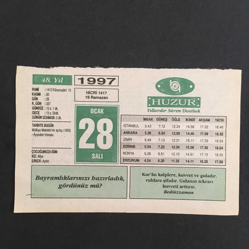 28 OCAK 1997-TAKVİM YAPRAĞI-DOĞUM GÜNÜ HEDİYESİ-HUZUR TAKVİMİ,MÜLKİYE MEKTEBİNİN AÇILIŞI 1859,AYONDON FIRTINASI,ÇOCUĞUNUZA İSİM,TERAVİH NAMAZI,HER İNSAN KENDİNİ SEVDİREBİLİR, 1 yıl önce satışa sunulmuştur.