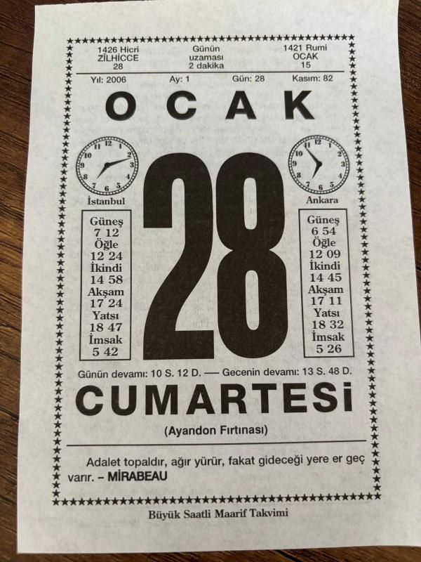 28 OCAK 2006 - TAKVİM YAPRAĞI - DOĞUM GÜNÜ HEDİYESİ - BÜYÜK SAATLİ MAARİF TAKVİMİ - MİRABEAU - LEYLA HANIM (SAZ) - DR. NEZİH HALİM NEYZİ'NİN VEFATI - NEYZEN TEVFİK KOLAYLI'NIN VEFATI, 3 ay önce satışa sunulmuştur.
