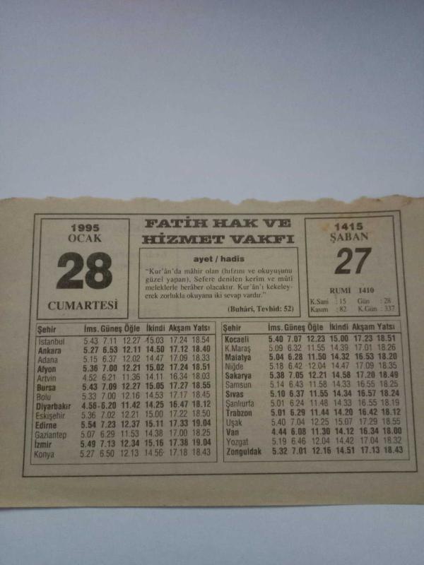 28 Ocak 1995-Orijinal Takvim Yaprağı-Doğum Günü-Söz,Nişan,Nikâh,Düğün ve Önemli Günler Hediyesi-Fatih Hak ve Hizmet Vakfı-Ayet/Hadis(Buhârî,Tevhid:52)-(Dünden Devam)-Sözün Özü-Damar Sertliği Çocukken Başlıyor başlıklı ürün, Efemera, Müzik, Sinema > Belge ve Evraklar > Takvimler kategorisi altında İkinci El olarak satılmaktadır.