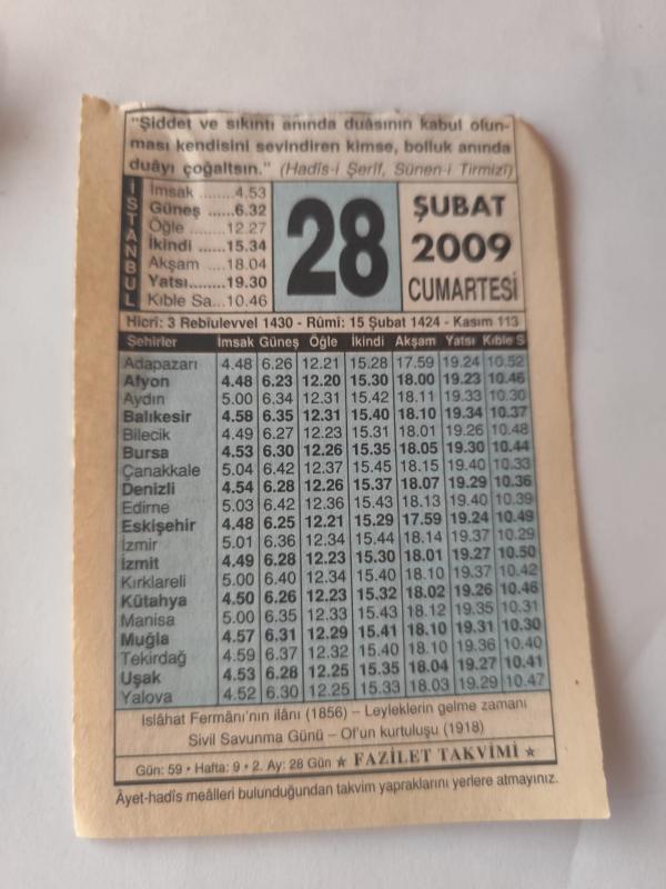 28 Şubat 2009-Orijinal Takvim Yaprağı-Doğum Günü-Söz,Nişan,Nikâh,Düğün ve Önemli Günler Hediyesi-Fazilet Takvimi-Ayet(Hadis)(Hadis-i Şerif, Sünen-i Tirmizi)-Islahat Fermanı'nın ilanı (1856)-Namazın Vaktini Geçirmek-1856 Islahat Fermanı başlıklı ürün, Efemera, Müzik, Sinema > Belge ve Evraklar > Takvimler kategorisi altında İkinci El olarak satılmaktadır.