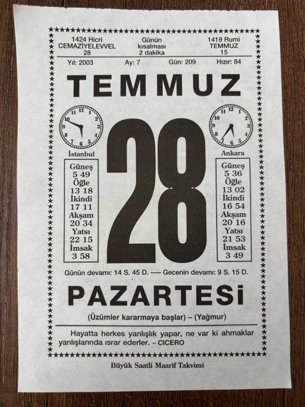 28 TEMMUZ 2003 - TAKVİM YAPRAĞI - DOĞUM GÜNÜ HEDİYESİ - BÜYÜK SAATLİ MAARİF TAKVİMİ - CİCERO - I.DÜNYA SAVAŞININ BAŞLANGICI - DEMİR YOLU DOĞUDA AŞKALE'YE VARDI - 3.SELİM ÖLDÜRÜLDÜ, en son 8 ay önce güncellenmiştir.