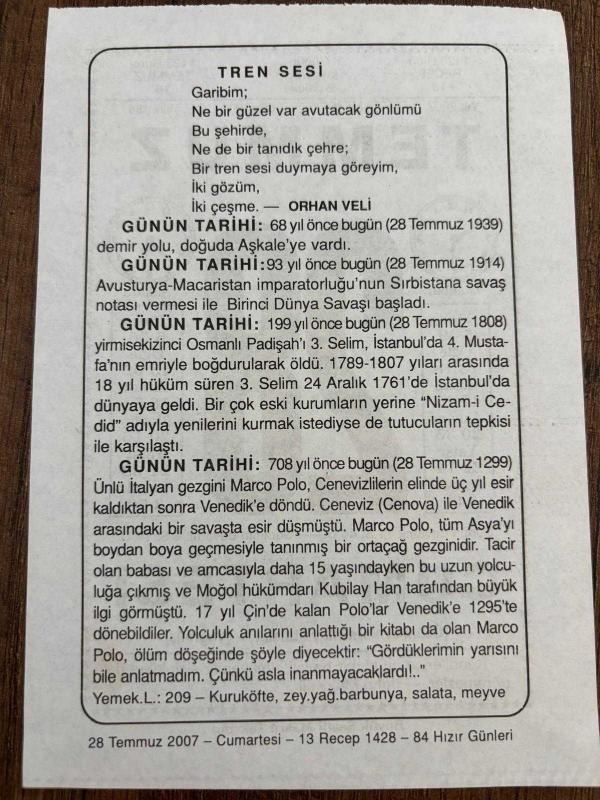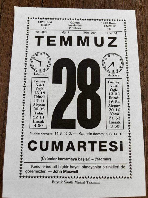 28 TEMMUZ 2007 - TAKVİM YAPRAĞI - DOĞUM GÜNÜ HEDİYESİ - BÜYÜK SAATLİ MAARİF TAKVİMİ - JOHN MAXWELL - ORHAN VELİ - 3.SELİM ÖLDÜRÜLDÜ - I.DÜNYA SAVAŞININ BAŞLANGICI - DEMİR YOLU DOĞUDA AŞKALE'YE VARDI, en son 8 ay önce güncellenmiştir.