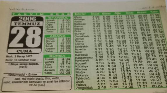 28 Temmuz 2006-Orijinal Takvim Yaprağı-Doğum Günü-Söz,Nişan,Nikâh,Düğün ve Önemli Günler Hediyesi-Bizim Anadolu Takvimleri-Ayet(Hz.Ali (r.a.))-(I.Dünya savaşı başladı. (1914))-Abdurreşid - Enise-Örnek İslam Kadını başlıklı ürün, Efemera, Müzik, Sinema > Belge ve Evraklar > Takvimler kategorisi altında İkinci El olarak satılmaktadır.