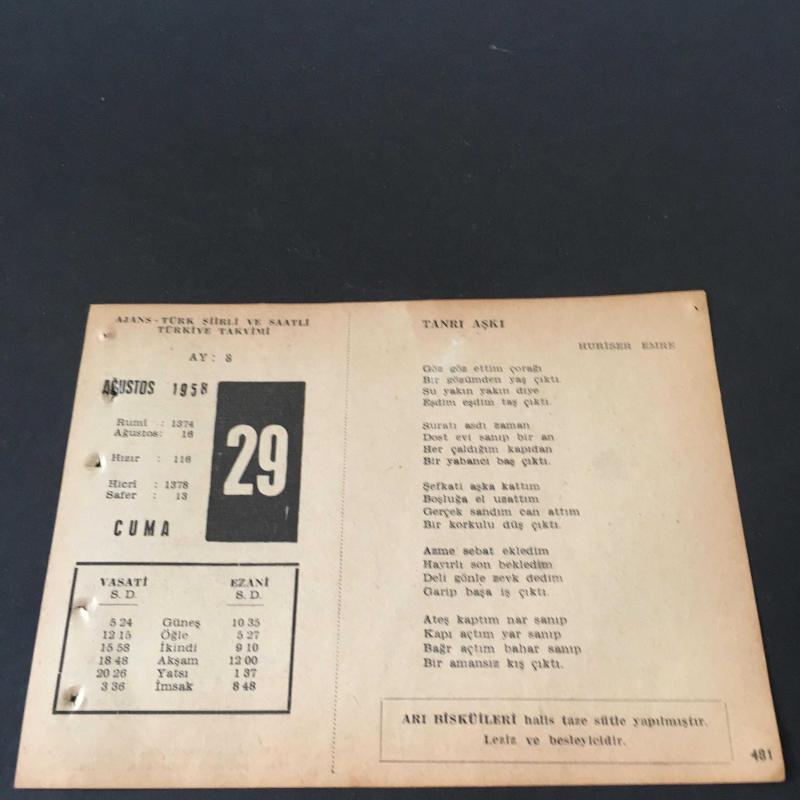 29 AĞUSTOS 1958 -TAKVİM YAPRAĞI-DOĞUM GÜNÜ HEDİYESİ-AJANS-TÜRK ŞİİRLİ VE SAATLİ TÜRKİYE TAKVİMİ,HURİSER EMRE,FAL,FIKRA,MOHAÇ MEYDAN MUHAREBESİ,1526,GÜZEL SÖZ,YEMEK LİSTESİ, en son 8 ay önce güncellenmiştir.