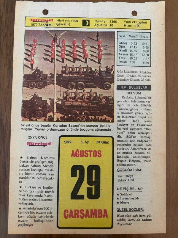 29 AĞUSTOS 1979 - TAKVİM YAPRAĞI - DOĞUM GÜNÜ HEDİYESİ - HÜRRİYET TAKVİMİ - PİS BİR İŞ ROMANI - Aktör Komik Abdi Efendi'nin ölümü (1914) - Türkiye'de telgraf haberleşmesinin başlaması - Mohaç Zaferi (1526) - Belgrat'ın fethi (1521) başlıklı ürün, Efemera, Müzik, Sinema > Belge ve Evraklar > Takvimler kategorisi altında İkinci El olarak satılmaktadır.