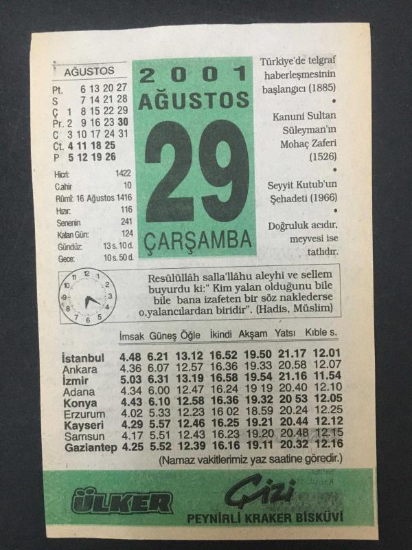 29 AĞUSTOS 2001-TAKVİM YAPRAĞI-DOĞUM GÜNÜ HEDİYESİ-ÜLKER TAKVİMİ,TÜRKİYEDE TELGRAF HABERLEŞMESİNİN BAŞLANGICI 1885,KANUNİ SULTAN SÜLEYMANIN MOHAÇ ZAFERİ SEYYİD KUTUBUN ŞEHADETİ 1966,MOHAÇ ZAFERİ, en son 8 ay önce güncellenmiştir.