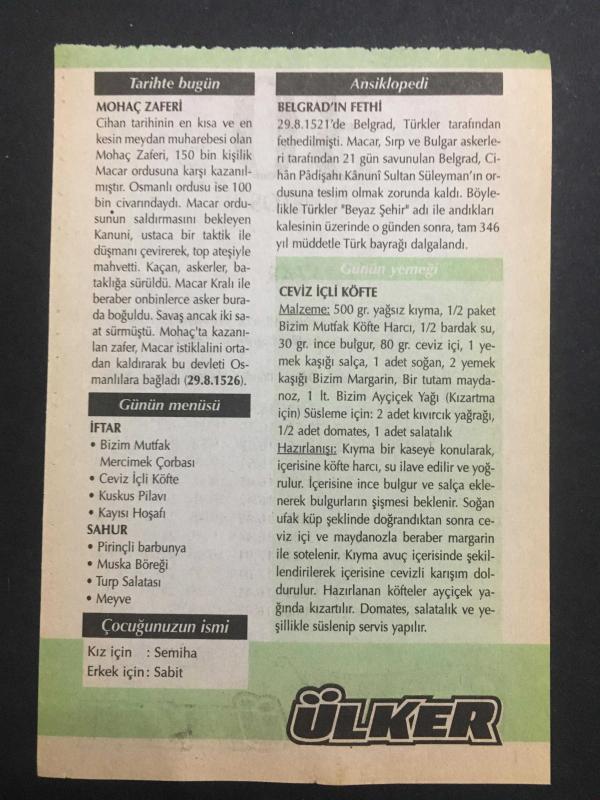 29 AĞUSTOS -2009-TAKVİM YAPRAĞI-DOĞUM GÜNÜ HEDİYESİ-ÜLKER TAKVİMİ,MAHOÇ ZAFERİ 1526,BELGRADIN FETHİ 1521,ÇOCUĞUNUZUN İSMİ,CEVİZ İÇLİ KÖFTE, 8 ay önce satışa sunulmuştur.