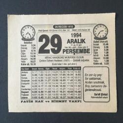 29 ARALIK 1994 -TAKVİM YAPRAĞI-DOĞUM GÜNÜ HEDİYESİ-FATİH HAK VE HİZMET VAKFI TAKVİMİ,MİRAC KANDİLİ,ÇERKES EDHEM HADİSESİ,1921,ŞİDDETLİ SOĞUKLAR