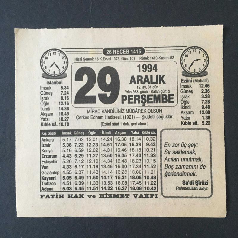29 ARALIK 1994 -TAKVİM YAPRAĞI-DOĞUM GÜNÜ HEDİYESİ-FATİH HAK VE HİZMET VAKFI TAKVİMİ,MİRAC KANDİLİ,ÇERKES EDHEM HADİSESİ,1921,ŞİDDETLİ SOĞUKLAR, en son 8 ay önce güncellenmiştir.