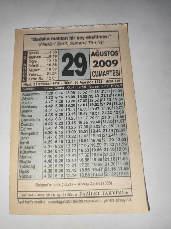 29 Ağustos 2009-Orijinal Takvim Yaprağı-Doğum Günü-Söz,Nişan,Nikâh,Düğün ve Önemli Günler Hediyesi-Fazilet Takvimi-Ayet(Hadis)(Hadis-i Şerif, Sünen-i Tirmizi)-Belgrad'ın Fethi (1521)-Zekat, en son 24 gün önce güncellenmiştir.