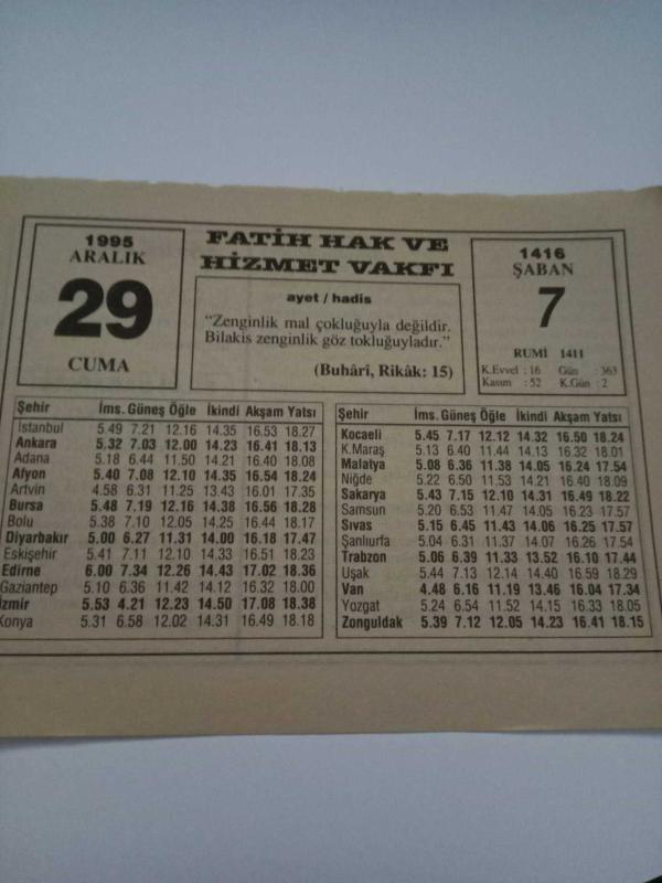 29 Aralık 1995-Orijinal Takvim Yaprağı-Doğum Günü-Söz,Nişan,Nikâh,Düğün ve Önemli Günler Hediyesi-Fatih Hak ve Hizmet Vakfı-Ayet/Hadis(Buhari,Rikak:15)-(Dünden Devam)-Sözün Özü-Taze Peyniri Keserken, 23 gün önce satışa sunulmuştur.