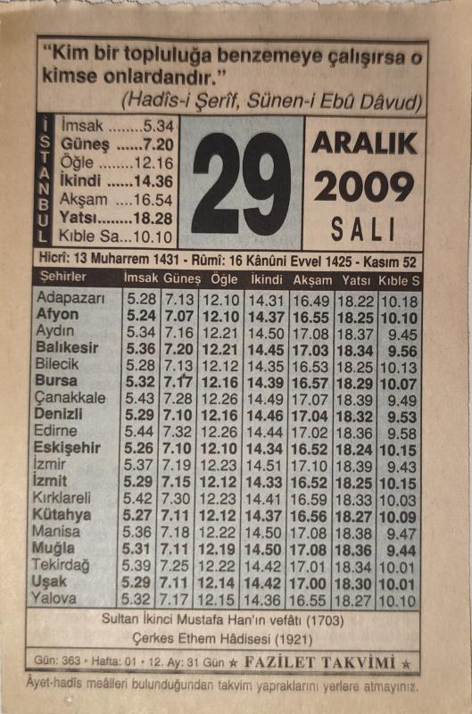 29 Aralık 2009-Orijinal Takvim Yaprağı-Doğum Günü-Söz,Nişan,Nikâh,Düğün ve Önemli Günler Hediyesi-Fazilet Takvimi-Ayet(Hadis)(Hadis-i Şerif, Sünen-i Ebu Davud )-Sultan İkinci Mustafa Han'ın Vefatı (1703)-Ehl-i Küfre Benzemekten Sakınmak, en son 3 gün önce güncellenmiştir.