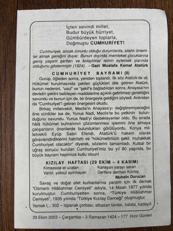 29 EKİM 2003 - TAKVİM YAPRAĞI - DOĞUM GÜNÜ HEDİYESİ - BÜYÜK SAATLİ MAARİF TAKVİMİ - ATATÜRK - CUMHURİYET BAYRAMI - KIZILAY HAFTASI - MUHSİN DURUCAN, en son 8 ay önce güncellenmiştir.
