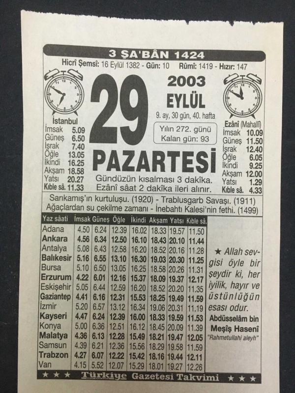 29 EYLÜL 2003-TAKVİM YAPRAĞI-DOĞUM GÜNÜ HEDİYESİ-TÜRKİYE GAZETESİ TAKVİMİ,SARIKAMIŞIN KURTULUŞU,1920,TRABLUSGARP SAVAŞI 1911,AĞAÇLARDAN SU ÇEKİLME ZAMANI,İNEBAHTI KALESİNİN FETHİ 1499,, en son 8 ay önce güncellenmiştir.