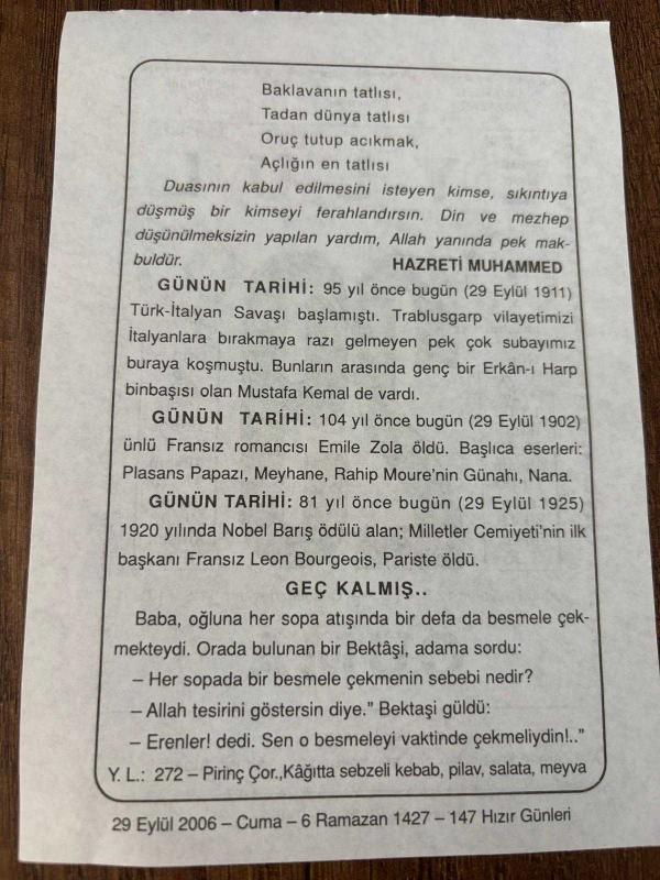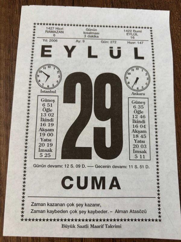 29 EYLÜL 2006 - TAKVİM YAPRAĞI - DOĞUM GÜNÜ HEDİYESİ - BÜYÜK SAATLİ MAARİF TAKVİMİ - ALMAN ATASÖZÜ - HZ.MUHAMMED - TÜRK-İTALYAN SAVAŞI BAŞLADI - FRANSIZ ROMANCI EMİLE ZOLA'NIN VEFATI - FRANSIZ LEON BOURGEOİS ÖLDÜ, en son 8 ay önce güncellenmiştir.