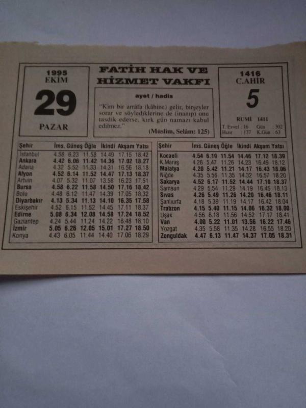 29 Ekim 1995-Orijinal Takvim Yaprağı-Doğum Günü-Söz,Nişan,Nikâh,Düğün ve Önemli Günler Hediyesi-Fatih Hak ve Hizmet Vakfı-Ayet/Hadis(Müslim,Selâm:125)-Dönme!-Erzurumlu Emrah-Vazife Şuuru, en son 4 ay önce güncellenmiştir.