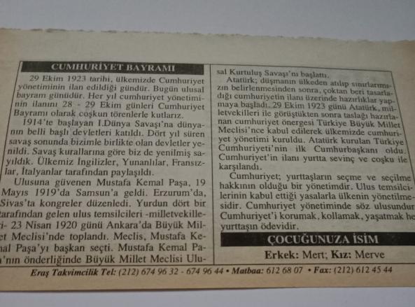 29 Ekim 2006-Orijinal Takvim Yaprağı-Doğum Günü-Söz,Nişan,Nikâh,Düğün ve Önemli Günler Hediyesi-ERAŞ Hizmet Takvimi-Ayet-Hadis(Cumhuriyet Bayramı Türkiye Cumhuriyeti'nin Kurtuluşu(1923))-Cumhuriyet Bayramı-Çocuğunuza İsim:Mert,Merve, en son 3 ay önce güncellenmiştir.