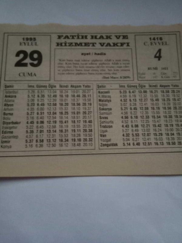 29 Eylül 1995-Orijinal Takvim Yaprağı-Doğum Günü-Söz,Nişan,Nikâh,Düğün ve Önemli Günler Hediyesi-Fatih Hak ve Hizmet Vakfı-Ayet/Hadis(İbni Mace:8/2859)Yardımlaşma ve Dayanışma Şuuru-Sözün Özü-İki Halife başlıklı ürün, Efemera, Müzik, Sinema > Belge ve Evraklar > Takvimler kategorisi altında İkinci El olarak satılmaktadır.