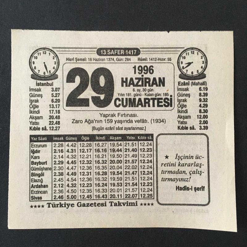 29 HAZİRAN 1996 -TAKVİM YAPRAĞI-DOĞUM GÜNÜ HEDİYESİ-TÜRKİYE GAZETESİ TAKVİMİ,YAPRAK FIRTINASI,ZARO AĞANIN 159 YAŞINDA VEFATI 1934,İNGİLİZ OYUNU, başlıklı ürün, Efemera, Müzik, Sinema > Belge ve Evraklar > Takvimler kategorisi altında İkinci El olarak satılmaktadır.