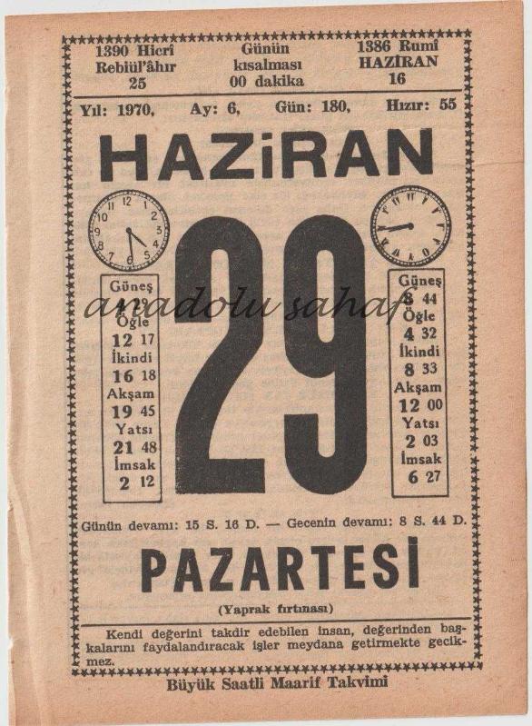29 Haziran 1970 / Büyük Saatli Maarif Takvimi