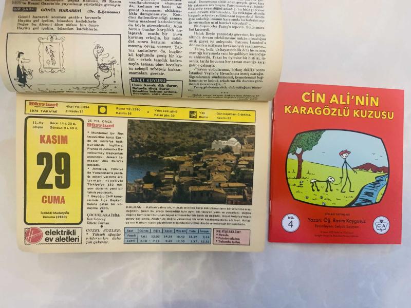 29 Kasım 1974 hediyelik orijinal Hürriyet takvim yaprağı (Cin Ali kitabı hediyeli:), 1 yıl önce satışa sunulmuştur.