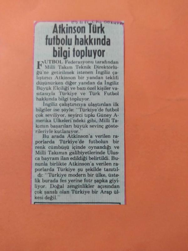 Kitap 1986 yılında yayınlanmıştır. 29 Kasım 1986 - Günaydın Gazetesi - Atkinson Türk futbolu hakkında bilgi topluyor - TFF tarafından Milli Takım Teknik Direktörlüğü'ne getirilmek istenen İngiliz çalıştırıcı Atkinson bir yandan teklifi düşünüyor bir yandan da Türkiye hakkında bilgi topluyor Gazete tam değil kupürüdür - 5x11cm ebatındadır.. adlı eser Türkçe dilindedir.