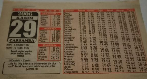 29 Kasım 2006-Orijinal Takvim Yaprağı-Doğum Günü-Söz,Nişan,Nikâh,Düğün ve Önemli Günler Hediyesi-Bizim Anadolu Takvimleri-Ayet(Zümer:9)-Genel seçim yapıldı ANAP birinci parti(1987)-Mücahid,Zerrin-Fani Dünya, en son 2 ay önce güncellenmiştir.
