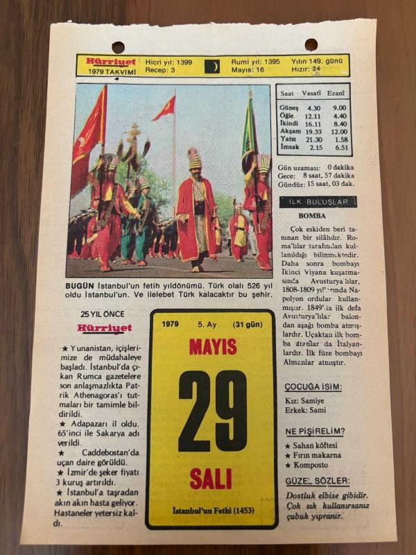29 MAYIS 1979 - TAKVİM YAPRAĞI - DOĞUM GÜNÜ HEDİYESİ - HÜRRİYET TAKVİMİ - ÖLÜM TANRISI ROMANI - İstanbul'da Fetih şenlikleri - Kırklareli'nde Kıyıköy Panayirı - Türk Bayrağı Kanunu'nun yürürlüğe girişi, en son 8 ay önce güncellenmiştir.