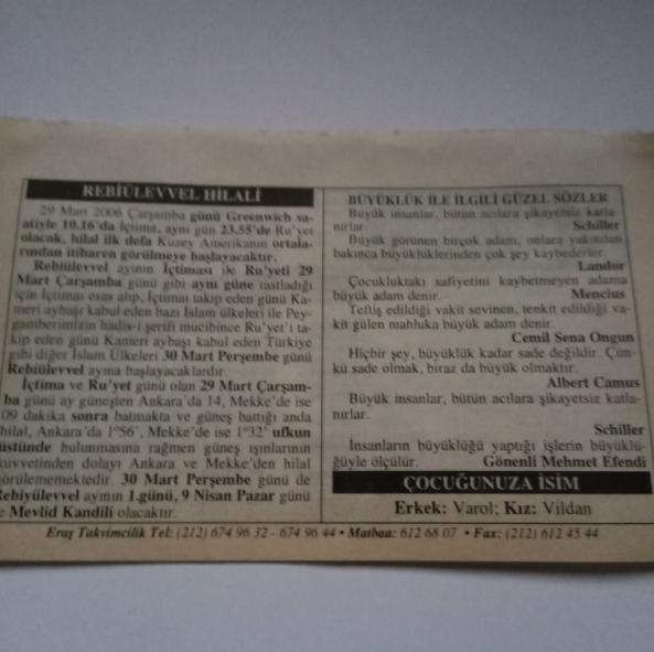 29 Mart 2006-Orijinal Takvim Yaprağı-Doğum Günü-Söz,Nişan,Nikâh,Düğün ve Önemli Günler Hediyesi-ERAŞ Hizmet Takvimi-Ayet-Hadis(Greenwich saatiyle 10.16'da içtima.23.55'de Ru'yet olacak,hilal ilk defa Kzuey Amerika'nın ortalarından itibaren batıya doğru batı ufku açık olan yerlerde görülmeye başlayacaktır)-Rebiülevvel Hilali-Büyüklük İle İlgili Güzel Sözler-Çocuğunuza İsim:Varol,Vildan başlıklı ürün, Efemera, Müzik, Sinema > Belge ve Evraklar > Takvimler kategorisi altında İkinci El olarak satılmaktadır.