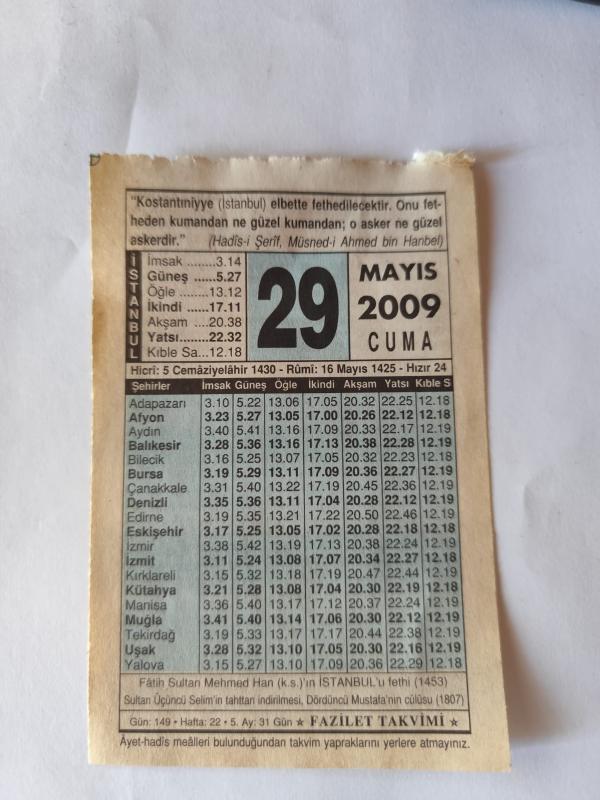 29 Mayıs 2009-Orijinal Takvim Yaprağı-Doğum Günü-Söz,Nişan,Nikâh,Düğün ve Önemli Günler Hediyesi-Fazilet Takvimi-Ayet(Hadis)(Hadis-i Şerif, Müsned-i Ahmed bin Hanbel )-Fatih Sultan Mehmed Han'ın İSTANBUL'u Fethi (1453)-İstanbul'un Fethine Manevi Ricalin Yardımı başlıklı ürün, Efemera, Müzik, Sinema > Belge ve Evraklar > Takvimler kategorisi altında İkinci El olarak satılmaktadır.