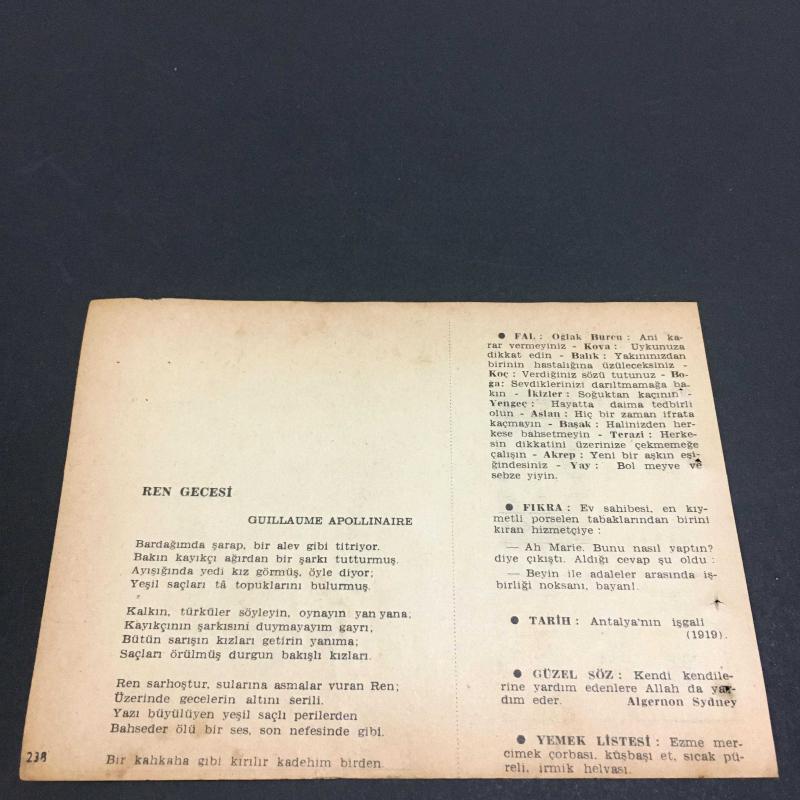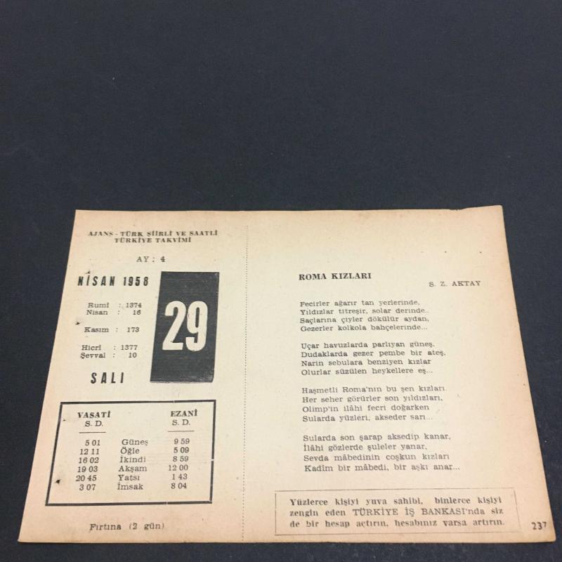 29 NİSAN 1958 -TAKVİM YAPRAĞI-DOĞUM GÜNÜ HEDİYESİ- AJANS-TÜRK ŞİİRLİ VE SAATLİ TÜRKİYE TAKVİMİ,S.Z.AKTAY,GUILLAUME APOLLINAIRE,FAL,FIKRA,ANTALYANIN İŞGALİ 1919,GÜZEL SÖZ,YEMEK LİSTESİ başlıklı ürün, Efemera, Müzik, Sinema > Belge ve Evraklar > Takvimler kategorisi altında İkinci El olarak satılmaktadır.