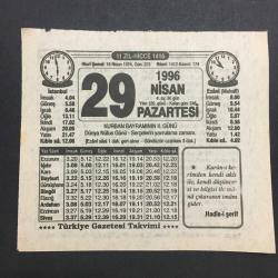 29 NİSAN 1996-TAKVİM YAPRAĞI-DOĞUM GÜNÜ HEDİYESİ-TÜRKİYE GAZETESİ TAKVİMİ,KURBAN BAYRAMININ 2. GÜNÜ,DÜNYA NÜFUS GÜNÜ,SERÇELERİN YAVRULAMA ZAMANI,ÖRNEK BİR DUA