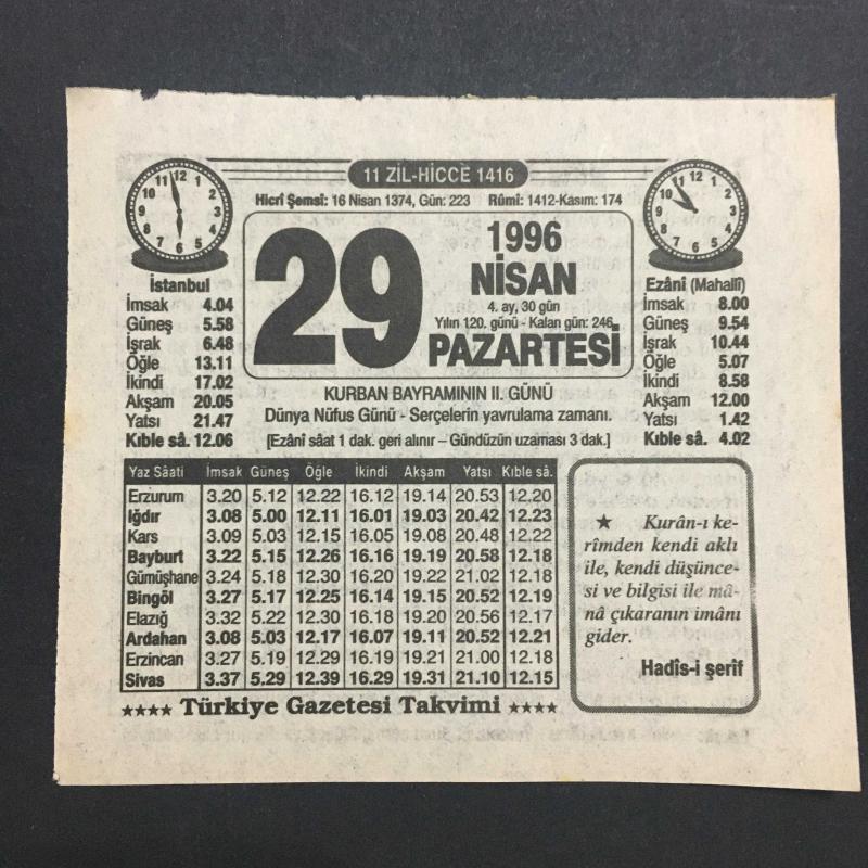 29 NİSAN 1996-TAKVİM YAPRAĞI-DOĞUM GÜNÜ HEDİYESİ-TÜRKİYE GAZETESİ TAKVİMİ,KURBAN BAYRAMININ 2. GÜNÜ,DÜNYA NÜFUS GÜNÜ,SERÇELERİN YAVRULAMA ZAMANI,ÖRNEK BİR DUA, en son 8 ay önce güncellenmiştir.