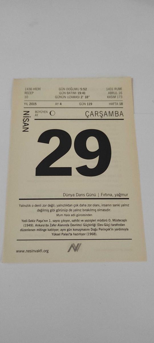 29 Nisan 2015-Orijinal Takvim Yaprağı-Doğum Günü-Söz,Nişan,Nikâh,Düğün ve Önemli Günler Hediyesi-Nesin Vakfı Takvimi-Yedi-Sekiz Paşa'nın 1. sayısı çıkıyor, sahibi ve yazıişleri müdürü O. Müstecaplı (1949). Ankara'da Zafer Alanında Devrimci Güçbirliği (Dev-Güç) tarafından düzenlenen mitinge katılıyor, aynı gün konuşmasını Doğu Perinçek'in yardımıyla Yüksel Palas'ta hazırlıyor (1968).-Fil Hamdi Nasıl Yakalandı?-Aziz Nesin'in Fil Hamdi adlı kitabından., en son 23 saat önce güncellenmiştir.