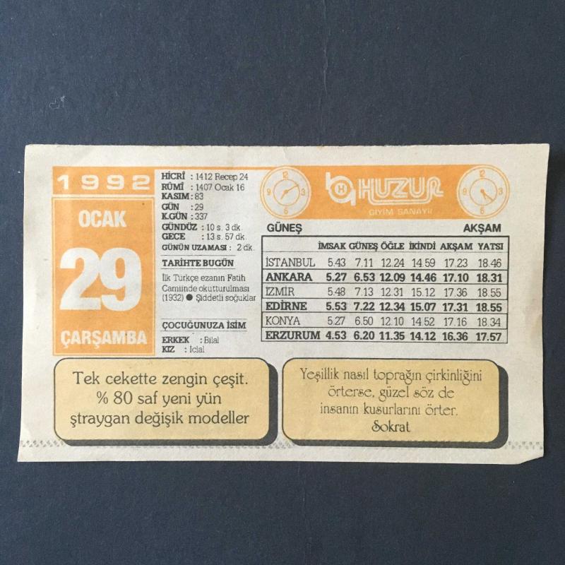 29 OCAK 1992 -TAKVİM YAPRAĞI-DOĞUM GÜNÜ HEDİYESİ-HUZUR TAKVİMİ,İLK TÜRKÇE EZANIN FATİH CAMİİNDE OKUTTURULMASI,1932,ŞİDDETLİ SOĞUKLAR,ÇOCUĞUNUZA İSİM,YANLIŞ ZAN,İLK PUL,KÖMÜR ÇARPMASI,ÖLÇÜLÜ OLMALIYIZ başlıklı ürün, Efemera, Müzik, Sinema > Belge ve Evraklar > Takvimler kategorisi altında İkinci El olarak satılmaktadır.