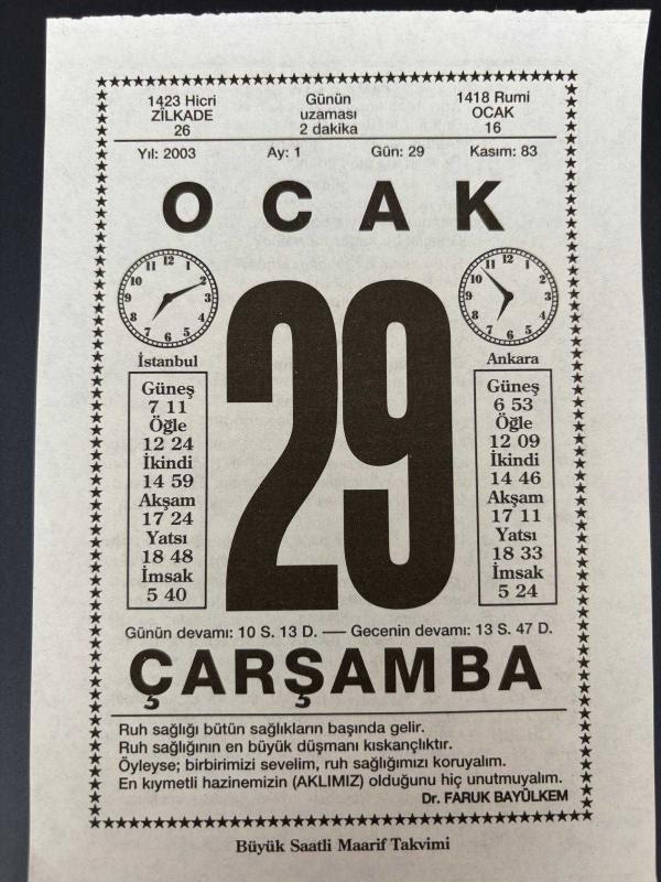 29 OCAK 2003 - TAKVİM YAPRAĞI - DOĞUM GÜNÜ HEDİYESİ - BÜYÜK SAATLİ MAARİF TAKVİMİ - DR. FARUK BAYÜLKEM - GÜLTEKİN SAMANOĞLU - 2. SELÇUKLU SULTAN'I ALPARSLAN'IN DOĞUMU - PROF. DR. TARIK ZAFER TUNAYA'NIN VEFATI, 7 ay önce satışa sunulmuştur.