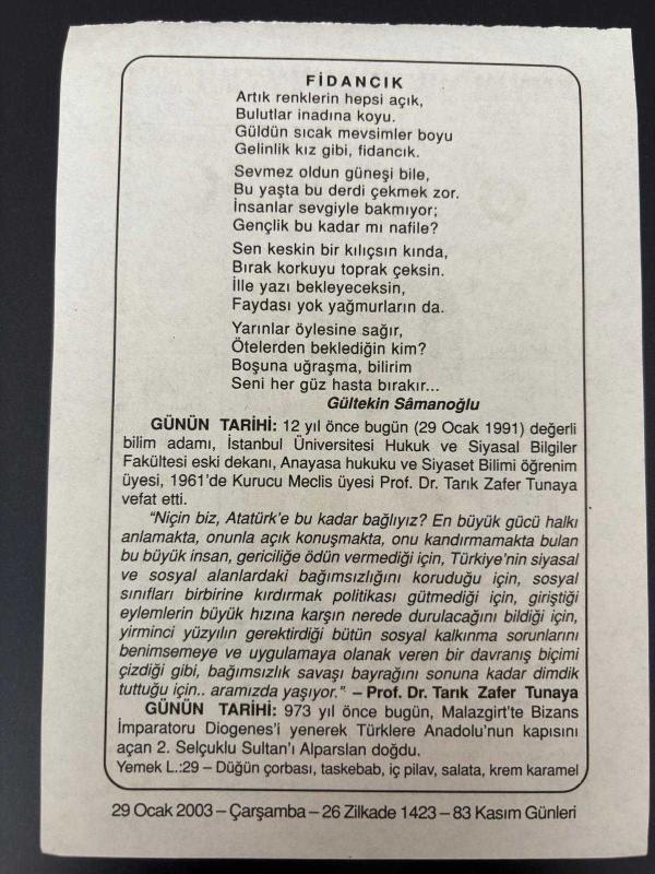 29 OCAK 2003 - TAKVİM YAPRAĞI - DOĞUM GÜNÜ HEDİYESİ - BÜYÜK SAATLİ MAARİF TAKVİMİ - DR. FARUK BAYÜLKEM - GÜLTEKİN SAMANOĞLU - 2. SELÇUKLU SULTAN'I ALPARSLAN'IN DOĞUMU - PROF. DR. TARIK ZAFER TUNAYA'NIN VEFATI başlıklı ürün, Efemera, Müzik, Sinema > Belge ve Evraklar > Takvimler kategorisi altında İkinci El olarak satılmaktadır.